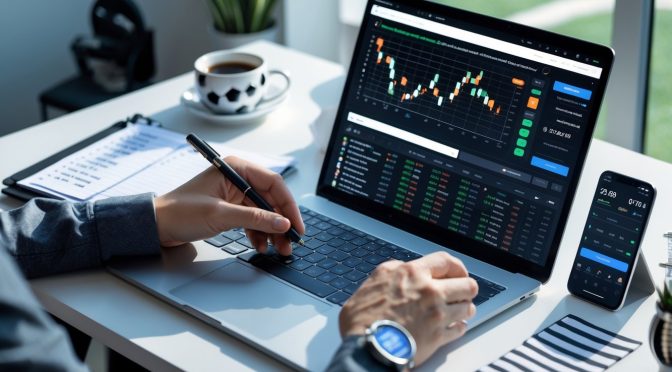 Sebuah meja kerja modern dengan laptop yang menampilkan data taruhan sepak bola, tangan seseorang sedang menganalisis informasi, dan smartphone dengan aplikasi taruhan terbuka.