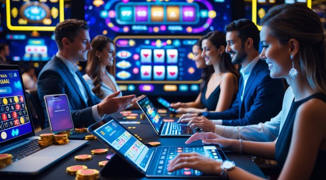 Beberapa orang bermain game kasino online dengan perangkat digital di lingkungan kasino virtual yang modern dan cerah.