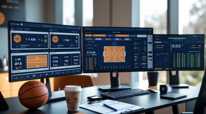 Meja kerja dengan beberapa layar menampilkan statistik bola basket, skor langsung, dan data prediksi odds.