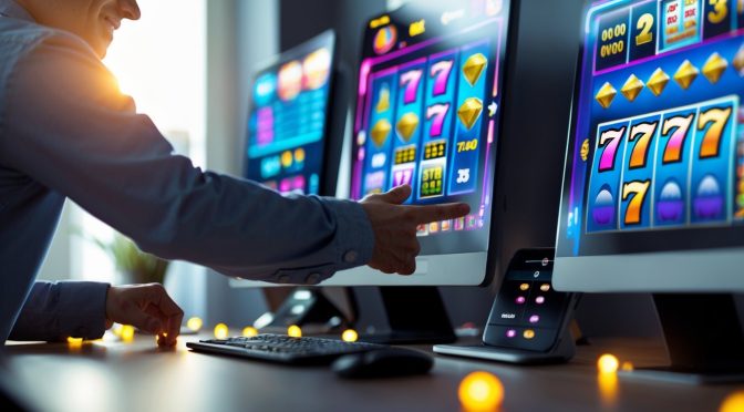 Seseorang sedang menggunakan komputer dengan tampilan mesin slot online yang berwarna-warni dan suasana yang nyaman.