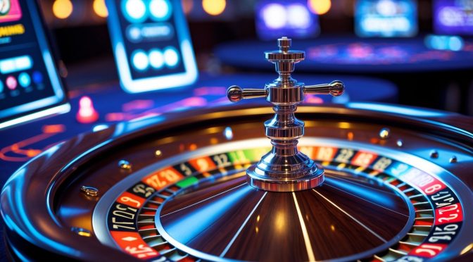 Roda roulette sedang berputar di meja taruhan dengan latar belakang suasana kasino modern.