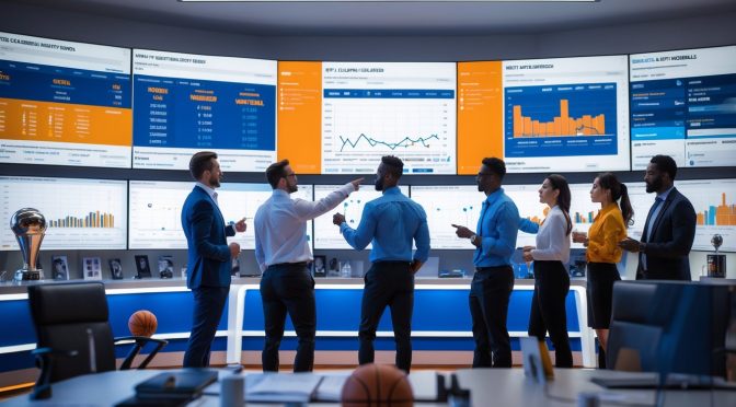 Sekelompok analis dan penggemar bola basket sedang berdiskusi di ruang kerja modern dengan layar menampilkan statistik dan grafik tim NBA.